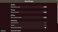 Added click sound when clicking buttons Added simple settings, that allow Muting audio Hiding level timer Hiding the number of clicks Turning off circle markings Square marking Displaying letters inst...